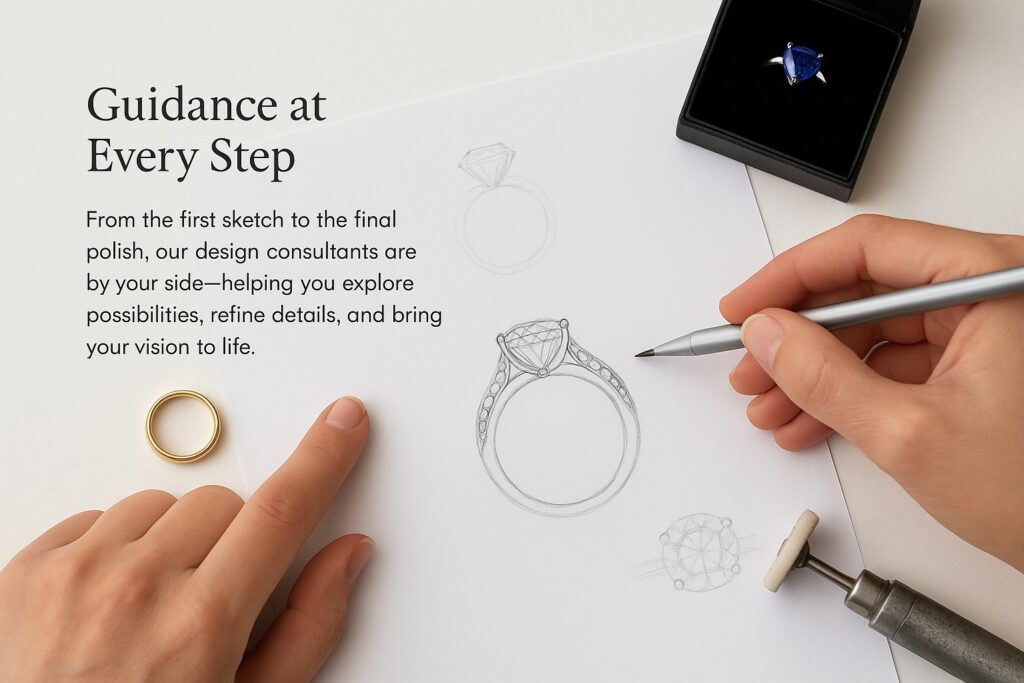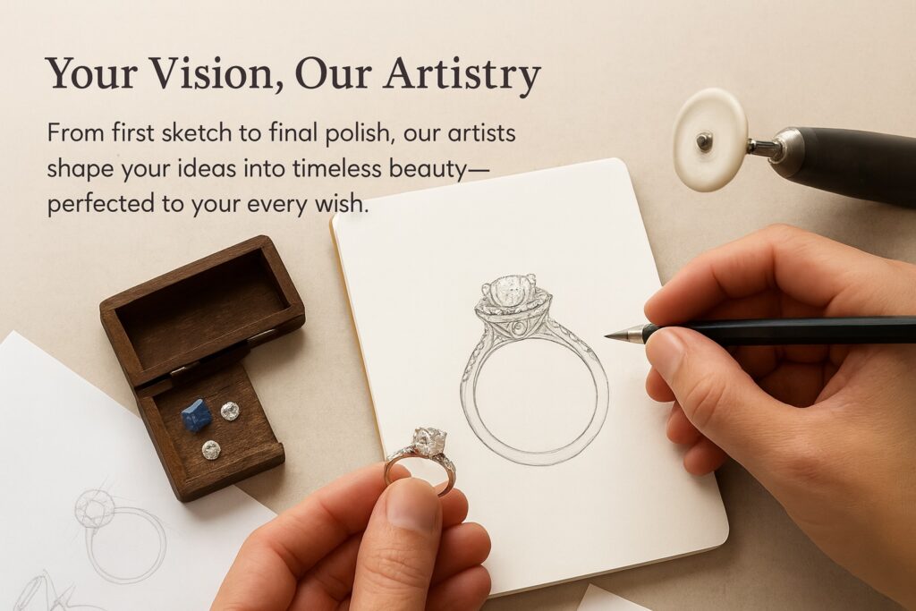 That’s perfectly fine. Many of our most beautiful creations began with just a feeling or a story. Our designers will gently guide you with sketches, inspiration boards, and gemstone options until the vision feels like it was always meant to be yours.